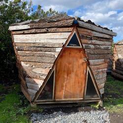 Wie wir schon bei der Buchung vermutet haben, ist die „Eco“- Unterkunft irgendetwas zwischen einer Baustelle, einem Provisorium und einer alternativen Herberge. Unser Schlafgemach ist eine Art überdimensionierte Hundehütte ganz aus Holz im selfmade-Stil, darin ein (wirklich bequemes) Doppelbett und gerade noch Platz genug, um unsere Rucksäcke abzustellen.