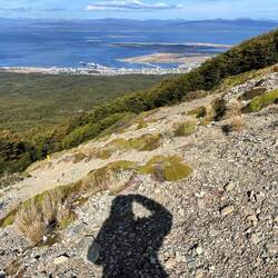 Der Weg steigt an und führt teilweise durch Bachbette und Sumpfgebiete. Es geht immer steiler bergauf und der Wald lichtet sich zusehends. Auf circa 600 m gelangen wir an die Baumgrenze und zu einem Aussichtspunkt hoch oben über Ushuaia, der uns bei klarer Sicht auch einen guten Blick über den Beagle-Kanal und hinüber zur (chilenischen) Insel Navarino ermöglicht.