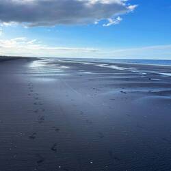 Da wir immer noch nicht genau wissen, wann mit der Hochflut zu rechnen ist, beraten wir hin und her, ob wir am Strand oder auf der (offenbar komplett überfluteten) Landstrasse zurück nach San Clemente gehen sollen. Wir entscheiden uns für den Strand, was sich als das absolut Richtige erweist. Zwar müssen wir uns bald wieder unserer Schuhe entledigen, um über zahlreiche Tümpel hinwegzusteigen, aber mit dem ständigen Blick aufs Meer mit vielen verschiedenen Wasservögeln ist es einfach spannender als auf einer Strasse…