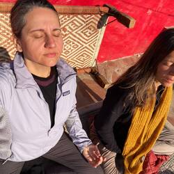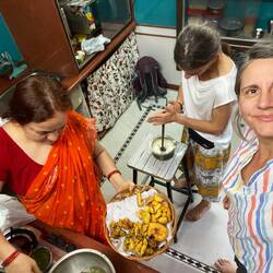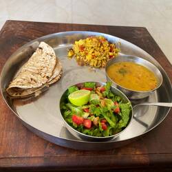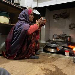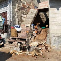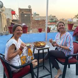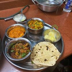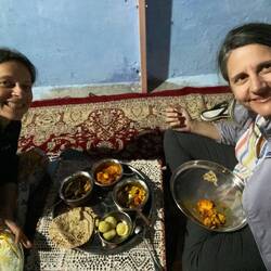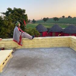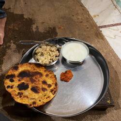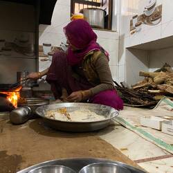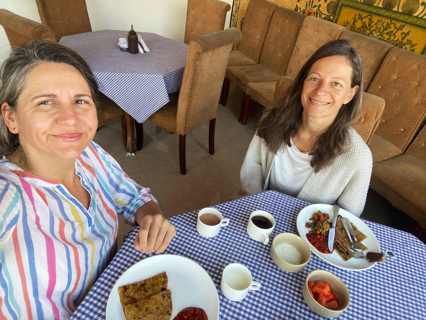 Wir verlassen gegen 7 Uhr unser „Lager“ um dem Sonnenaufgang am Dach des Haupthauses zu huldigen. Danach gemeinsames Frühstück am Boden der warmen Küche! Es gibt Paratha (das sind frische fladenbrotartige Dinger mit klein geschnittenem Gemüse in ein wenig fett raus gebrutzelt ), Joghurt und ein Porridge, was zwar nicht wie unser gewohntes Porridge aussieht, es jedoch sehr gut schmeckt und deswegen auch aufgegessen wird. Der frisch zubereitete Chai Masala darf nicht fehlen. Auch die Milch dazu ist von den eigenen Tieren!. Wir unterhalten uns mit Händen und Füßen, was halt der kleine Küchenboden erlaubt und verabschieden uns nach einer kurzen Meditation in der Sonne und machen uns mit unserem Fahrer auf den Weg in den Shri Jasnath Ashram ca 1 1/2 Autostunden entfernt. Dort angekommen, werden wir in ein wunderschönes Haus, was eher einem englischen Schloss gleicht, gebracht und dürfen dort unser Zimmer beziehen. Dann werden wir auch gleich Mittagessen gebeten. hier instruiert uns eine ältere Amerikanerin, welche schon 2 Wochen dort lebt. Und mindestens bereits 1 mal vorher dort war. Sie macht gerade einen malenden, künstlerischen Rückzug. Nur sie und ihre Kunst. Wir bekommen Chiabatti, gemischte Gemüsereis, Dahl und (tatsächlich) Salat. Es war sooooo gut!!!