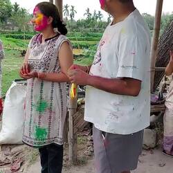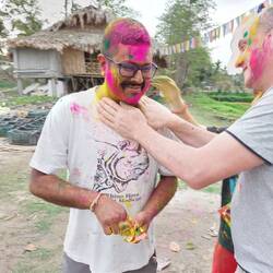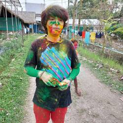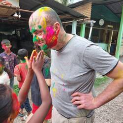 Heute wird Holi gefeiert! Auch hier auf dem Land! Gruppen von Kindern kommen vorbei und mit " Happy Holy" Rufen schmiert man sich gegenseitig mit Farbe ein und lacht sich schlapp. Süßigkeiten gibt'sLæs mere
