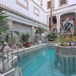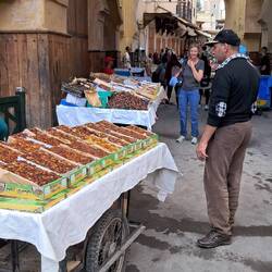 In Fes angekommen machten wir uns auf den Weg in die Medina, am Königspalast vorbei und durch den Park "Jardin Jnane Sbil". Durch schmale Gassen, vorbei an unzähligen Händlern. Schließlich gönnten wir uns eine Verschnaufpause in einem unglaublich schönen Riad (Stadthaus mit Innenhof). Es stellte sich heraus, dass dies der oder dem italienischen Botschaft(er) gehört.