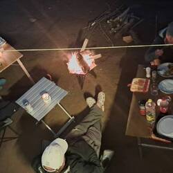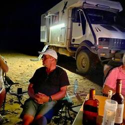 Kurz bevor wir unseren Nachtlagerplatz erreichten, kam uns auf der Piste ein Landy entgegen und plötzlich gab's ein riesiges "Hallo". Das Paar aus dem Geländewagen waren Bekannte einer unserer Mitreisenden. Bis weit in die Nacht saßen, aßen und ratschten wir bei Kerzenlicht am Fuß einer hohen Düne.