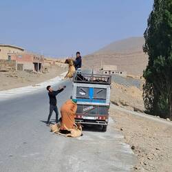 Der 2. Teil des Rosentales begann in der Ortschaft Bou Tharar. Nachdem wir Tags zuvor falsch abgebogen waren und schließlich die Nacht in den Bergen verbrachten, fuhren wir zurück und setzten die Runde fort. Bereits in der 1. Kurve wurde es schon knapp für unseren "Dicksten", der vorfuhr. Auf ausgewaschener, steiler Schotterstraße mitten durch den Ort, begleitet von jubelnden, schreienden und bettelnden Kindern. Die nächsten ca. 2 Stunden ging es meistens sehr einsam durch tolle Landschaft. Ab und zu musste unser "Dickster" (Mercedes Allrad LKW mit nicht allzu großer Bodenfreiheit) den Weg mit Steinen unterfüttern, damit er nicht aufsetzte.