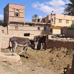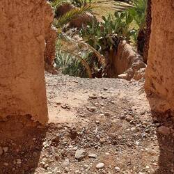 Morgens hatten wir viel Spaß mit den absolut harmlosen Wasserdurchfahrten des Flussbettes (Oued) Gheris nach dem gestrigen Gewitter. Mittags erreichten wir die kleine Stadt Goulmima, in der jeder seinen Besorgungen nachging. Wir spazierten in das ca. 1,5 km entfernte "Ksar", das ist die Altstadt, ein uraltes Lehmdorf aus engen, dunklen und zum Teil überdachten Gängen mit einem Hauptplatz und einer Moschee. Wie ein lebendes Museum mit Kühen und Eseln in nicht überdachten Ställen, Frauen, die an den Bewässerungskanälen ihre Wäsche wuschen und Leute, die am Brunnen vor dem Eingangstor Wasser in Kanistern mit der Schubkarre zu sich nach Hause fuhren. Nur war dies kein Museum sondern Realität! Zurück liefen wir durch den wunderschön schattigen Palmengarten, in dem die Bauern ihre Arbeit erledigten.