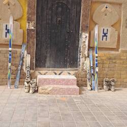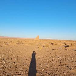 Ein weiteres Kunstwerk in der Nähe fuhren wir noch an, bzw. drum herum, bevor es eeeendlich zum Erg Chebbi ging. Von weitem konnte man schon am Horizont der blauschwarzen Steinwüste Erg Chebbi, Berge gelber Sanddünen, erkennen. Bei Merzouga liegen, neben den Dünen von Erg Chegagga, die einzig höheren Sanddünen Marokkos. Wüsteneinsamkeit findet man hier zwar nicht unbedingt, aber etwas Wüstenfeeling kann man trotzdem erleben. Das Angebot an Ausflügen mit Kamelen bzw. Dromedaren und Vermietung von Quads und sogar Smowboards ist groß.