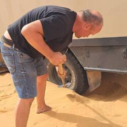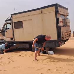Diese Gelegenheit mussten wir einfach nutzen, um mit den Wohnmobilen Übungsfahrten im Sand zu unternehmen. Roland allerdings war zu abenteuerlustig und so mussten alle mithelfen, den 5 Tonner wieder aus dem Sand zu buddeln.
