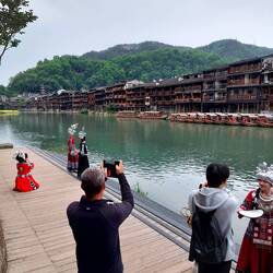 In 5 Stunden geht es mit meist über 300 km/h im Schnellzug durch das Land nach Fenghuang 🚄. Das kleine Städtchen am Fluss mit ihren historischen Holzhäusern ist ein Hotspot für einheimische Touristen. Mit Englisch kommt man hier nicht weit, in den Restaurants ist alles nur auf chinesisch. Zum Glück gibt es heute mit Google Lense ein ausgezeichnetes Tool um Sachen zu übersetzen und so sind wir froh abends im Restaurant nicht blindlings das erste Menü bestellt zu haben. Im bestellten Tofu-Eintopf gibt es zwar auch noch einiges vom Schwein dazu, aber immer noch besser als der Katzeneintopf (wenn man der google Übersetzung trauen kann 🤪) vom Menü 2 auf der Karte… 😸 Am besten einfach gar nicht nachschauen was man da isst, oder erst im Nachhinein 🤣. Das Dorf ist wunderschön, aber alles doch sehr inszeniert für die heimischen Touri’s. Die Gebäude am Flussufer sind heute ausschliesslich Hotel’s, (überteuerte) Restaurant’s oder Souvenirläden. Die lokale Bevölkerung wohnt heute ausserhalb der Stadt in den Neubau-Siedlungen. Rund 15 km ausserhalb der Stadt befindet sich auch die südliche grosse Mauer, die wir noch besuchen vor unserer abendlichen Weiterreise. Diese ist nicht ganz so gross und bekannt wie die nördliche. Die Feinde im Süden sollen nicht ganz so stark gewesen sein wie die im Norden, darum ist die Mauer doch deutlich kleiner gebaut worden 😄. Rund 2 km sind heute zugänglich. Sicherlich nicht ganz so imposant wie die nördliche, dafür auch nicht so überlaufen, wir waren nämlich neben einem einheimischen Pärchen die einzigen Besucher.Leia mais