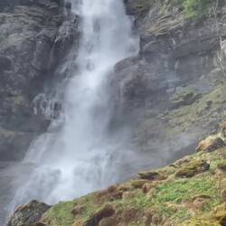 A la fin de la descente, nous entendons un torrent gronder, et voyons au loin une cascade. Une immense cascade!