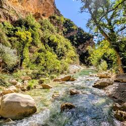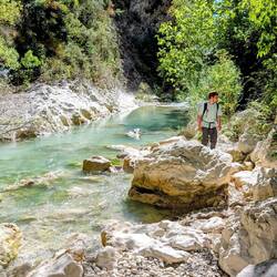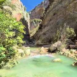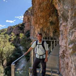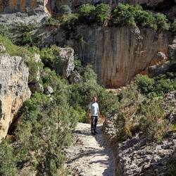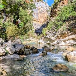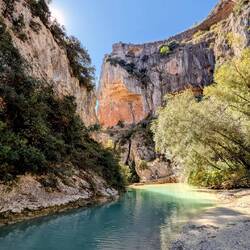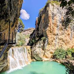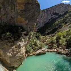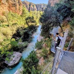 Die Ruta de las Pasarelas del Vero in Alquézar führt über schmale Stege, Metallpassagen und Brücken direkt am Río Vero entlang. Auf dem Weg geht es durch eine beeindruckende Schlucht mit steilenもっと詳しく