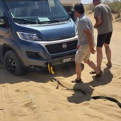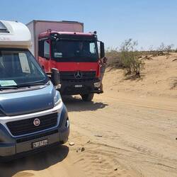 Dies funktionierte unter Stress einigermassen gut. Die Anforderungen an die Fahrer waren sehr hoch. Die Konzentration und das Reaktionsvermögen wurde während neun Stunden ununterbrochen auf die Probe gestellt. Zwischendurch gab es zwei kurze Fahrpausen und ein Tankstop. Es reichte nicht einmal die Zeit, um schnell auf die Toilette zu gehen. Bis wir zu einer "Abzweigung" gelangten, nach gut 270 Kilometern. Von da an gings vorerst über eine Sandpiste bergauf. Das musste mit Schwung und Traktionsunterstützung gemeistert werden. Es ging nicht lange, schon steckten Jean-Claude und Ruth im Sand fest. Dies bedeutete den ersten Einsatz für Jacques mit seinem LKW. Kein Problem...innert ein paar Minuten waren sie wieder frei. Für mich aber genügend Zeit um auf unsere Toilette zu gehen...