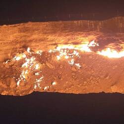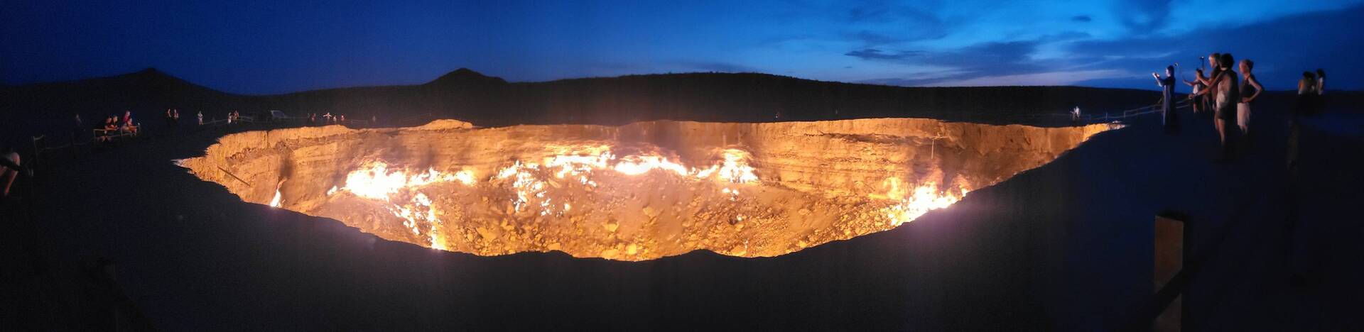 Krater. Sein Durchmesser beträgt ca 200 Meter mit einer ungefähren Tiefe von 50 Metern. Seit 1971 brennt in ihm ein wahrhaftiges Höllenfeuer. Der Krater entstand bei Erkundungsarbeiten, Gas strömte aus und wurde von den Geologen angezündet, weil man glaubte, es sei eine Blase und sonst nichts. Die Blase erwies sich als gut "vernetzt". Der Präsident gab 2010 die Anordnung, den Krater zu schliessen, aus Umwelt- und Sicherheitsgründen. Getan wurde bis heute nichts.