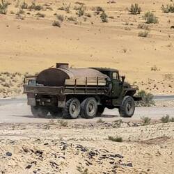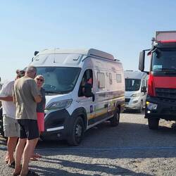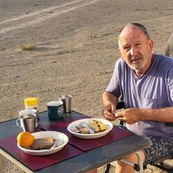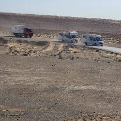 Noch war die Wüste angenehm in den Temperaturen, ein lauer Wind ging und das Frühstück konnten wir in Gesellschaft von drei Kamelen einnehmen. Etwas vor acht Uhr starteten wir die Motoren. Wir wussten, dass uns ein langer Fahrtag von 298 Kilometern bevorstand. Dies bei einem Durchschnittstempo von maximal 20 Kmh. Die Sandpiste meisterten wir diesmal ohne Hilfe von Jacques. Zurück auf der Strasse Nr. 1 erwarteten uns schadenfreudige Schlaglöcher. Es dauerte nicht lange bis die Blechkarawane an der ausgefransten Schlaglochpiste einen ersten Nothalt einläutete. Gerd und Jacques waren gleich bei Achim und Dani. Wieder war es der Hymervan der ein Problem hatte. Ein Reifen verlor Luft. Gerd steckte ins Loch einen " Kaugummi" und Jacques pumpte die Reifen zu einem guten Pneudruck auf.