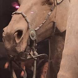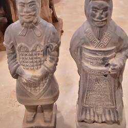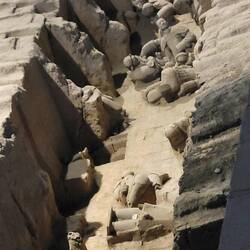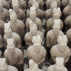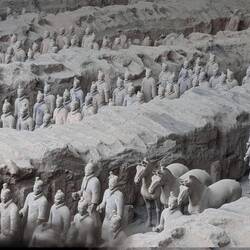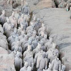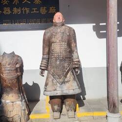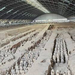 Da standen nun die max. 65'000 täglichen BesucherInnen. Kopf an Kopf, Körper an Körper, Schweiss überall...hinfallen wäre lebensbedrohlich geworden. Wir wurden mehr oder weniger in die "Grube 1" geschoben. Die von einem gewölbten Dach im Stil einer Bahnhofshalle geschützte Grube (230 m lang, 62 m breit) ist die grösste und würde den besten Eindruck von der Soldaten- Aufstellung bieten, wenn man dann über die Menschenköpfe hinweg sehen könnte. Peter und ich wollten nur noch raus...beim ersten erreichbaren Notausgang verliessen wir das Gebäude.. Ein zwei Fotos auf Zehenspitzen gemacht bleiben uns als Erinnerung aus der Haupthalle. In "Grube 2" war das Gedränge nicht mehr so schlimm, aber ohne Ellenbogen gings auch da nicht. Immerhin konnten wir hier Figuren, Waffen u.Ä. aus der Nähe sehen.