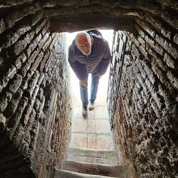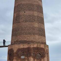 Die Temperaturen fielen zwischendurch auf 2°C. Rings um uns lagen Hügel mit einer feinen Schneekappe aufgesetzt. Auf dem Display leuchtete das Signet einer Schneeflocke auf. Bis zur lebhaften, in der "samstageinkaufsfiebrigen" Stadt Tokmok, beruhigte sich das Wetter immer mehr. Jetzt wurden wir von Baustelle zu Baustelle mit Einbahnstrassen und Betonblöcken gefordert. Mitten im Verkehrschaos und vielen Fussgängern mussten wir unser Ungetüm wenden. Mit viel Geduld und einer Portion Humor fanden wir zurück auf unsere geplante Route. Die Strasse entsprach nicht ganz unseren verwöhnten europäischen Ansprüchen. Trotzdem erreichten wir 15 Kilometer südlich von Tokmok das wichtigste architektonische Denkmal des gesamten Landes, das berühmte Minarett von Burana. Es hatte ursprünglich eine Höhe von über 45 Metern. Bei einem Erdbeben brach der obere Teil ab und es blieben etwa 22 Meter erhalten. Dieser Stumpf wurde saniert und so kann man über eine enge, dunkle Wendeltreppe bis zur Aussichtsplattform klettern und hat einen herrlichen Panoramablick auf den kirgisischen Alatoo und das Chu-Tal. Klar, dass Peter, trotz Wolken verhangener Berge, die sportliche Herausforderung annahm. Mit Fantasie konnte er sich die Aussicht vorstellen.