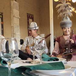 Vor dem Mahl spielte eine vierköpfige Musikgruppe auf traditionellen Instrumenten folkloristische, kirgisische Musik. Zwischendurch erzählte uns ein Manas Erzähler gestenreich und aus voller Brust ein Epos über einen kriegerischen Zwischenfall. Dank Irina hatten wir eine Ahnung, über den Inhalt des Vortrages.Meer informatie