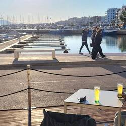 Zu Fuss erkundeten wir unsere nähere Umgebung entlang der Meerespromenade. Puerto de la Duquesa, einst ein eher beschaulicher Fischerhafen mit dem Castello de la Duquesa, hat sich in den letzten Jahrzehnten zu einem lebendigen Ferienort entwickelt. Kulinarisch ist die Auswahl beachtlich: britische, spanische, indische und amerikanische Bistros und Pubs reihen sich rund um den Hafen aneinander. Darben muss hier niemand. Die Lokale stehen dicht gedrängt wie Hühnerställe, auf den "Stangen" sitzen die Touristen und lechzen nach Sonne und Wärme. Wenn der Wind einmal nicht tobt, wird es in der Sonne richtig angenehm.