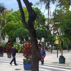 Auf der Plaza del San Francisco legten wir eine Pause ein. Sandwiches, Sonne - und immer heftigere Windböen. Die riesigen Ficus-Bäume auf dem Platz boten etwas Schutz, doch die eigentliche Gefahr kam von hinten: Plötzlich flogen schwere Metallstühle der umliegenden Cafés über den Platz. Uns wurde mulmig. Wir hatten noch unsere Campingtische vor dem Wohnmobil stehen. Wenn die auch Flügel bekommen sollten... und die Nachbarfahrzeuge waren Liner der Upper-upperclass. Ob unsere Versicherung wohl "fliegende Campingtische" abdeckt?