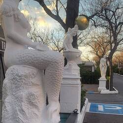 Zwischen Valencia und Tarragona, in der Nähe von Peñiscola, sind wir nun auf einem grossen Campingplatz gelandet, der sich als sauber, praktisch und erfreulich unkompliziert erweist. Keine falschen Versprechen - einfach solide spanische Camping-Realität. Wobei "solide" hier durchaus mit einem Augenzwinkern zu verstehen ist. Es gibt tatsächlich einen geheizten, gedeckten Pool mit Aussenbecken - was bei stürmischem Wetter Gold wert ist. Und dann wäre da noch das Ambiente: Über den ganzen Platz verteilt stehen weissleuchtende Statuen von nackten, oder sehr leicht bekleideten Meerjungfrauen und Nackedeien, die besonders abends eine fast mystisch-kitschige Atmosphäre erzeugen.