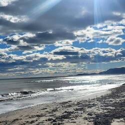 Die Küste zeigt sich naturbelassen, breit und offen. Nach den heftigen Stürmen der letzten Wochen hat sich das Meer kurzerhand bis auf das Küstensträsschen ausgedehnt und dabei Sand und Kies grosszügig neu verteilt. Die Natur kennt keine Strassenplanung - sie macht ihr Ding.