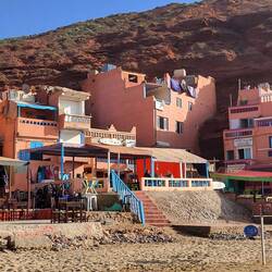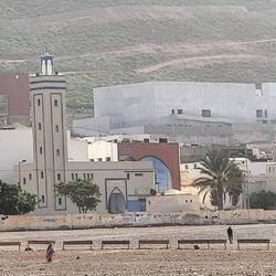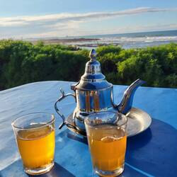 Nach ungefähr 50 Kilometern erreichen wir die Abzweigung nach Sidi Wassay, unser heutiges Etappenziel. Die Zufahrt zum Camping führt uns um einige schmale Strassen und Häuserecken (15 Kilometer)...wir fragen uns öfters, ob wir uns wirklich auf Google verlassen können...aber die Menschen am Strassenrand grüssen freundlich und wirken nicht beunruhigt. 😀 So nähern wir uns immer mehr einer grossen Düne. Dahinter liegt der kleine Ort am Rande des "Sous-Massa-Nationalpark". Ein schneeweisses Marabout-Mausoleum mit himmelblauer Kuppel direkt am Meer ist von Weitem sichtbar. Marabout bezeichnet man in Marokko und Westafrika islamische Heilige. Um deren Grabstätten herum entstanden Sufi-Zentren. Man erkennt die Anlagen zumeist an den mit Kalk geweissten Kuppelbauten. Bei einem Thé menthe, orange cannelle und Fruchtsalat kommen wir schnell wieder zu Ruhe.