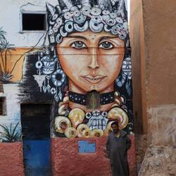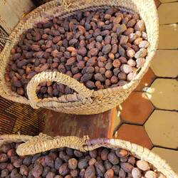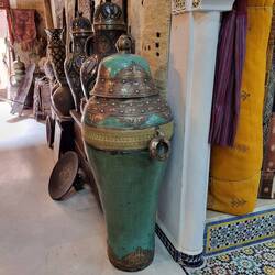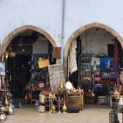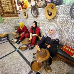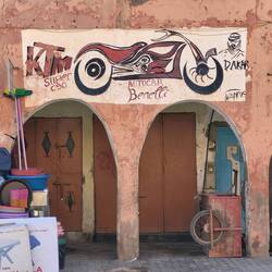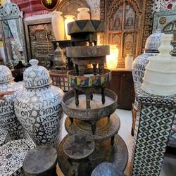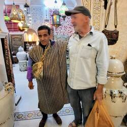 Natürlich ist ein Besuch in einer Arganöl-Kooperativen ein Muss. Bei einem Glas Tee darf ich selber ein wenig Hand anlegen, bei den Ölmühlsteinen. Danach werden wir in den Verkaufsraum geführt. Nun ja, ich muss zugeben das Arganöl mit etwas Brot zusammen schmeckt mir sehr. Aber der Preis für einen Liter umgerechnet ca CHf50.-- eher weniger...Ein Massageöl gegen Schmerzen kaufen wir. Als nächste Station führt uns Rajid ins Judenviertel. Dort verschafft er uns Eintritt in das einzige Antiquitätengeschäft der Stadt. Der höfliche Händler empfängt uns, nachdem er das Geschäft mit wunderbaren Leuchtern erhellt hat. Wir staunen ob den wunderschönen Exponaten, welche von Berbern, Arabern, Tuareg, Juden, und Afrikanern traditionell hergestellt wurden. Diese natürlich auch zu erschwinglichen Preisen... So höflich wie uns der Händler begrüsst hat, so höflich verabschiedet er uns und löscht das Licht in seinen heiligen Hallen.