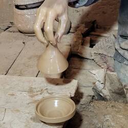 In der Töpferstadt Safi möchte ich gerne einen Zwischenhalt einlegen. Wir können bis kurz vor die Tore der Medina fahren. Die mittelalterliche Medina ist sehr gut besucht. Da es beinahe keine Touristen gibt, fallen wir natürlich sofort auf. Ein älterer, ziemlich ausgemergelter Marokkaner spricht uns auf französisch und englisch an. Da er mir den Weg zu den Töpferern zeigen will, werde ich schwach....unser Vorsatz, ohne Guide durch die Medinas zu schlendern, hat genau eine Woche gehalten. Doch immerhin kommen wir an einen Ort, den wir selber nie gefunden hätten. Ein junger Töpferkünstler zeigt uns sein Kunsthandwerk. Erklärt von der Gewinnung des Lehms bis zum Ofenbrand...natürlich werden wir von unserem Guide nun zur Verkaufsausstellung geführt. Viel zu teuer, aber sehr schöne Trinkbecher und eine Schüssel erstehe ich dort. Alles in dieser Kooperativen hergestellt, in typischem Berberstil. Den Guide sind wir mit Ach und Krach nach einem Obolus losgeworden.