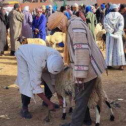 Guelmim ist eine richtige Wüstenstadt, in die wir auf breiten Strassen durch riesige Tore hineinrollen. Auch als Tor zur Sahara wird diese Garnisons-und Grenzstadt benannt. Die Westsahara ist jetzt nicht mehr weit. Unser Hauptgrund für den Besuch gilt dem Markt, welcher auf der Strecke in Richtung Tan Tan, jeden Samstagmorgen stattfindet. Ursprünglich wurden hier Kamele gehandelt, denn Guelmim war seit Jahrhunderten eine wichtige Karawanenstadt auf dem Weg nach Timbuktu (Mali). Heute sind es hauptsächlich Ziegen, Schafe und Kühe, welche auf dem Viehmarkt ihren Besitzer wechseln. Doch gibt es auch Kamele (Dromedare), welche feilgeboten werden. Ein Targi /Tuareg spricht uns an und meint lachend, ob wir an einem Kamel interessiert sind. Der Preis für ein solches beträgt ungefähr 10'000 MAD /ungef. Chf 900.--. Ein weisses Dromedar kostet jedoch mehr, da es bereits aus 50 Kilometern Entfernung Wasser in der Wüste riechen kann. Das hat natürlich seinen Preis!