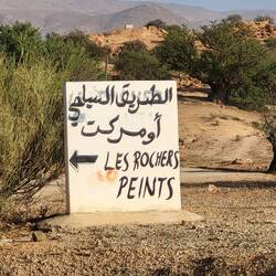 Heute zieht es uns in die Berge mitten in das Anti-Atlas-Gebirge. Von unserem Ausgangspunkt des "Franzosen-Altenheim" in Tiznit verlassen wir die Stadt in Richtung Tafraoute. Es liegen rund 110 Kilometer vor uns. Eine immer spektakulärer werdende Route. Langsam windet sich die Strasse hinauf bis zum Col du Kerdous (1220M.ü.Meer) Fantastische Ausblicke bieten sich uns. Die Berghänge sind von Terrassenfeldern geprägt, welche über Generationen hinweg in mühevoller Handarbeit angelegt wurden. Oben auf der Passhöhe wartet das Hotel Kerdous auf vorbeiziehende Reisende. Wir machen da gerne einen Teehalt mit Biscuits, den Blick auf die zurückgelegte Serpentinenstrecke gerichtet . Leila, die dreijährige Tochter des Wirtepaares leistet uns dabei Gesellschaft. Ich versuche per Google-Übersetzer mit ihr ins Gspräch zu kommen. Immerhin versteht sie die Frage nach ihrem Namen!