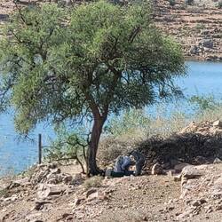 Weiter geht es nun auf der gut ausgebauten Strasse, die sich spektakulär am Berghang entlangwindet. In dem wildromantischen Bergland gedeihen Argan- und Mandelbäume, welche langsam zu blühen beginnen, Kakteen und bereits etwas gelbleuchtender Gingster. Der Frühling scheint vor der Tür zu stehen! Die Strecke verliert allmählich an Höhe und es geht langsam aber stetig bergab. Bei dem kleinen Ort Aït M'Zal erscheint wie aus dem Nichts ein blauer See. Über dem Ufer entdecke ich eine Frau, welche Wäsche schruppt. Ein Mann holt Wasser in Kanistern und trägt es zur Wäscherin. Ein Bild wie aus einem früheren Zeitalter.