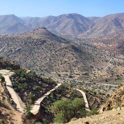 Im Hintergrund in der Ferne sieht man den Hohen ⁴Atlas mit zum Teil verschneiten Berggipfeln. Allmählich schraubt sich die gut ausgebaute Strasse hinauf auf die Höhen des Anti-Atlas. Zwei Pässe müssen wir überwinden. Wir bewegen uns nun zwischen 1'000 und 1'700 Metern über dem Meeresboden. Ein wunderbarer Ausblick mit unglaublich schöner Landschaft breitet sich vor uns aus. In stetem Auf und Ab geht es nun durch einsame Bergdörfer. Zunächst ist die Landschaft noch geprägt von Arganbäumen, frisch angesäten Getreidefeldern und Kakteen, doch dann wird der Bewuchs immer spärlicher.