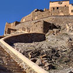 Die Rochers Peints sehen wir uns doch nicht an. Wir verlassen diese imposante und erholsame Region. Zunächst geht es durch das Ammelntal. Überall entdecken wir schöne Dörfer, welche wie Schwalbennester an den Berghängen kleben. Dahinter schroffe Granitfelsen mit bis zu 2'000 Meter hohen Berggipfeln im Hintergrund. Eine beeindruckende Kulisse. Wir gelangen allmählich in das Tal der Agadire. Ein besonders gut erhaltenes Exemplar liegt direkt an unserer Route. Der Agadir Tizourgane. Wir machen einen Halt um dieses Bauwerk genauer anzusehen. Eine steile und lange Treppe führt zum Eingangstor. Zum Glück sind bereits zwei Männer vor uns, welche die gleiche Idee haben. Vergebens machen sie den Aufstieg. Das Tor ist und bleibt verschlossen...wir bleiben unten und betrachten die Anlage nur von ausserhalb der Mauern.