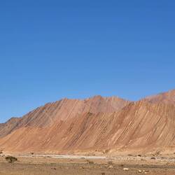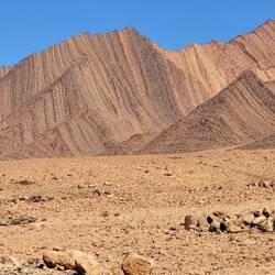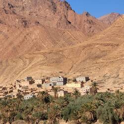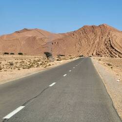 Was war nun zu erst? :))... oder wie mit einem Kamm durchzogen. Bizarr geformt mit verschiedenfarbigen Sedimentschichten in Kreisbögen und Dreiecken. Erdengeschichte. Wahre Gemälde und Wunder der Natur! Wir kommen nicht mehr aus dem Staunen heraus. Dieses Bild begleitet uns über 70 Kilometer hinweg. Nach der Passhöhe des Tizi-Touzlimt führt die Strasse nun stetig bergab. Immer wieder überqueren wir ausgetrocknete Oueds. (Flüsse). Palmengesäumte Wadis ( Schluchten /Täler) und kleine Dörfer mit rosafarbenen Häusern sorgen für reizvolle Kontraste. Dazu kommt noch diese Einsamkeit. Kaum Fahrzeuge oder Touristen begegnen uns.