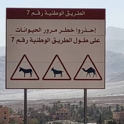 Die restlichen rund 60 Kilometer führen uns durch eine Steinwüste, die auch Hammada genannt wird. Erste kleine Sanddünen und Verkehrsschilder mit Warnhinweisen bezüglich Sandverwehungen bestätigen uns, dass wir auf dem richtigen Weg in Richtung Wüste sind. Es sind kaum Menschen und Fahrzeuge unterwegs. Umso mehr fällt uns ein Mann auf, welcher sein Fahrrad stosst. Er gibt uns Zeichen. Zuerst etwas unsicher halten wir an. Es ist ein junger Deutscher, welcher von Agadir aus über den Anti-Atlas alleine mit seinem Fahrrad für geplante sechs Wochen unterwegs ist. Er klagt über grosse Knieschmerzen und fragt, ob wir ihn ein Stück mitnehmen. Gerne helfen wir ihm. Während Peter und Peter das Fahrrad in unseren "Keller" verstauen, entdecke ich am Strassenrand einige, weidende Dromedare.