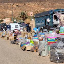 Auf halber Strecke erreichen wir Igherm. Der kleine Ort liegt auf 1'700 Metern Höhe. Heute Mittwoch ist Markttag. Die Strassen sind dicht bevölkert...Google Maps weiss dies natürlich nicht und leitet uns durch die Marktstände und Menschenmassen. Peter sucht den besten Weg um aus dem Dickicht von Menschen und feilgebotenen Waren heraus zu kommen. Erstaunlicherweise geht dies problemlos. Den Menschen hier scheinen solche Szenarien vertraut zu sein. Auf die vorgesehene Kaffeepause verzichten wir aber lieber. Das Wohnmobil ist doch etwas gross und auffällig...
