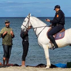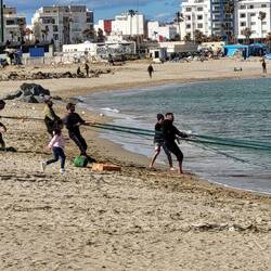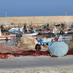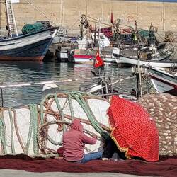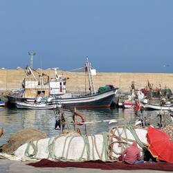 Nach der lebhaften Medina in Tétouan entspannen wir bei einem ausgedehnten Strandspaziergang, bei angenehmer Meeresbrise. Wir beobachten junge Marokkaner, wie sie mit viel Kraft und Ausdauer vom Strand aus ihr mit einem Gummiboot ausgefahrenes Fischernetz wieder an Land ziehen. Endlich den Fang an Land, kommen zwei Polizisten auf Pferden daher geritten und weisen diese paar jungen Männer zurecht. Ob sie sich wohl unrechtmässig mit Fisch aus dem Meer bedient haben?