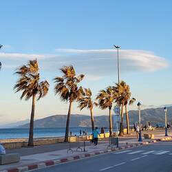 Die restlichen Kilometer führen uns durch landwirtschaftlich genutzte Flächen, welche durch eine Lagunenlandschaft geprägt sind. In Oued Laou fahren wir direkt zu einem öffentlichen, bewachten Parkplatz, direkt an der Strandpromenade. Bereits stehen einige Wohnmobile auf dem Platz. Ein Parkwächter in gelber Weste fragt uns, ob wir über Nacht bleiben wollen. Dem ist so. Dies koste 20 MAD. Wir sind etwas erstaunt über den Preis. Auf Park4Night haben wir 50 MAD gelesen. Toiletten, Frischwasser und Entsorgungsmöglichkeit für Schwarzwasser. Der Parkwächter fragt gleichzeitig nach Kleidern, Schuhen und zuletzt nach Bier. Mit Letzterem können wir ihm dienen...frage aber, wie er das mit seinem Glauben vereinbaren könne. Irgend eine für ihn zurecht gebogene Erklärung gibt er mir auf französisch zur Antwort ...die Parkgebühr will er noch nicht einkassieren. Nebenan steht die Moschee...