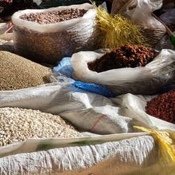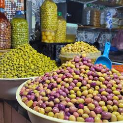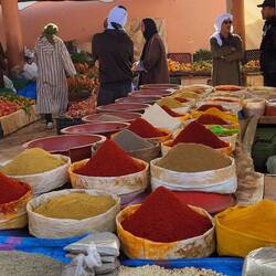 Überall in den Souks und Medinas gibt es ein riesiges Angebot von Gewürzen. Darunter gehören Kreuzkümmel, Zimt, Koriander, Ingwer oder auch die edlen Safranfäden. Raz el Hanout, eine pikante Gewürzmischung aus 44 verschiedenen Zutaten, Harissa eine scharfe Würzpaste, Thymian, frischen Koriander, Minze oder Petersilie gehören ebenfalls an einen gut sortierten Gewürzstand.