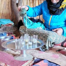 Der marokkanische Pfefferminztee, auch bekannt als "Berber-Whisky" oder "Pfefferminztee aus dem Maghreb" steht auf jeder Speisekarte in Marokko. Das Nationalgetränk ist ein Zeichen der marokkanischen Gastfreundschaft und wird oft als Begrüssungsgetränk serviert. Die Kombination aus Grüntee, Minzeblättern und Zucker scheint vorallem den Marokkanern so gesüsst zu schmecken. Wenn ich Tee bestelle, dann immer ohne Zucker. Der Zucker liegt dann schön im Tellerchen bereit. Je nach Region und Jahreszeit wird der Grüntee an Stelle der Minze mit Zitronenverbene oder Wermutkraut ergänzt. Auf unserer 4x4 Exkursion zum Erg Chegaga wurden wir von einer Nomadin zu einem Tee eingeladen. Dazu bot sie uns Datteln und frisch gebackenes Fladenbrot an. In Marokko wird der Minztee getrunken, um das Beisammensein zu geniessen. Einer der schönsten und eindrücklichsten Momente welche ich aus Marokko in Erinnerung behalte. Ein arabisches Sprichwort besagt, dass immer drei Gläser getrunken werden sollen. "Das erste Glas ist süss wie die Liebe, das zweite hart wie das Leben und das dritte bitter wie der Tod".
