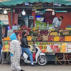 Viele verschiedene frisch zubereitete Fruchtsäfte und Smoothies werden im ganzen Land angeboten. Ein besonders eindrückliches und riesiges Angebot erwartete uns in Marrakesch auf dem Djemaa el-Fna Platz. Ein Novum für mich waren die Avocado- und Zuckerrohrsäfte. Bei der Bestellung eines Avocadosaftes achte ich darauf, dass er mit Orangensaft ergänzt wird. Die Ergänzung mit Datteln und Milch bekam mir nicht gut.