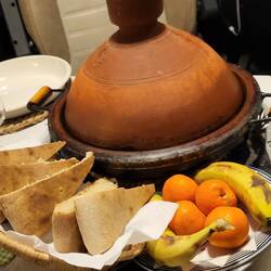 Als Nationalgericht gilt sicher an oberster Stelle die Tajine ein köstliches Eintopfgericht. Der Name bezeichnet dabei nicht nur das Gericht, sondern auch die Zubereitung. Der traditionelle Eintopf wird in einem spitz zulaufenden Tontopf zubereitet. Die Rezepte reichen von unterschiedlichen Fleisch- bis zu Fisch-, Gemüse oder Obstvariationen. Zuunterst kommt Fleisch oder Fisch, darauf werden Kartoffeln und Gemüse geschichtet und das Ganze dann langsam über Holzkohle gegart. Man isst zuerst das Gemüse und zuletzt das Fleisch, Geflügel oder den Fisch. Zum Austunken der Sauce benutzt man das reichlich bereit gestellte und meist noch warme Fladenbrot. Tajines werden überall in den Restaurants und am Strassenrand angeboten. Unsere erste Tajine in Asilah mit Rindfleisch Pflaumen und Rosinen bleibt mir als besonderen Schmaus in guter Erinnerung.