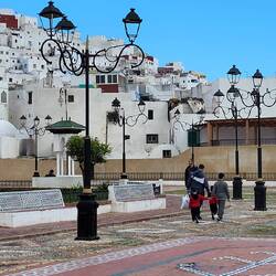 Die Stadt an den Hängen des Rifgebirges ist geprägt von strahlend weissen und neu renovierten Kolonialbauten. Der Taxichauffeur bringt uns mitten hinein ins spanische Viertel der Neustadt Ensanche an den Place Moulay el-Mehdi. Auf der westlichen Seite des Platzes die Iglesia de Bacturia. Die katholische Kirche wurde 1926 erbaut. Noch heute feiern hier die Katholiken ihre Gottesdienste. Es ist wohl die einzige Kirche in ganz Marokko, wo stündlich die Kirchturmuhr schlägt.