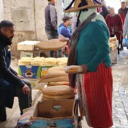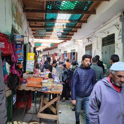 Uns kommt diese lebhafte, noch sehr ursprünglich und autenthische Medina aber nicht so klein vor...immer wieder gibt es Seitengässchen, die in neue Gebiete führen. Von der Gasse der Silber- und Goldschmiede kommen wir zu Gemüse, Fleisch und Fisch, anschliessend befinden wir uns in einer Gasse mit einer grossen Menschenmenge, welche an gebrauchten Kleidern, Schuhen, Nähmaschinen, Schrauben, Mixern usw ihr Kaufinteresse zeigen. Plötzlich stehen wir in der Gasse mit Holz- und Töpfereiartikeln ....dazwischen riecht es sehr gut nach frischen Backwaren. Wir geniessen die Gerüche und Geräusche, la pura vida...