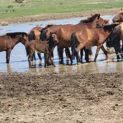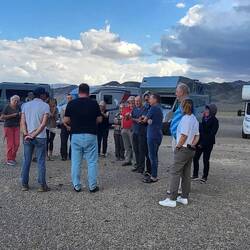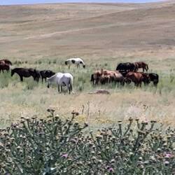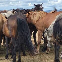 Mit den grauen, niedrigen Bussen gings für die Erkundungstour flott über Stock und Stein. Wir wurden ziemlich durchgerüttelt. Aber es lohnte sich. Zuerst mit viel Fantasie, aber dann doch konkret konnten wir die Pferde in ihrem weitläufigen Gebiet bestaunen. Die Stuten in Begleitung ihrer Fohlen. Sie schienen gerade ihr Nachtessen einzunehmen, während die Sonne sich langsam hinter den Bergen vom Tag verabschiedete.