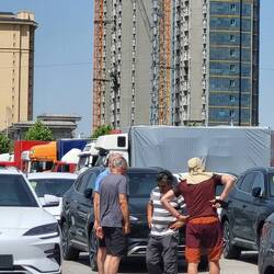 Mit Franz und Hi-Suk verbrachten wir einen gemütlichen Abend, bei einem sehr guten Abendessen. Wir wollten uns bei den Beiden für ihre ärztliche Betreuung in Samarkand und Tashkent bedanken. Als wir gegen 21 Uhr aus dem Lokal traten trafen gerade Wolfgang und Gaby mit ihrem Bimobil ein. Freudig wurden sie von der Gruppe empfangen. Mit neuer Lichtmaschine, Batterie und neuem Motorsteuergerät scheint ihr Fahrzeug wieder Einsatztüchtig zu sein. Mit viel Engagement von der " Rennleitung und technischem Support" wurde das Unmögliche möglich gemacht. Drei Tage voller Einsatz unter drückender Hitze haben sich für uns alle gelohnt. Denn wie bereits früher erwähnt, müssen wir als Gruppe genau so wie aufgelistet nach China einreisen. Nun steigt die Spannung! China wir kommen. Nach gut vier Jahren die ersten Wohnmobile und dies an einem Grenzposten, der Neuland für Abenteuer-Touren ist.