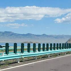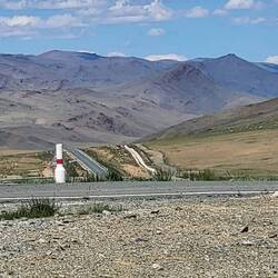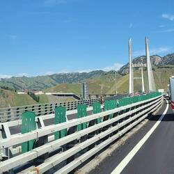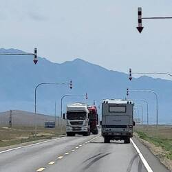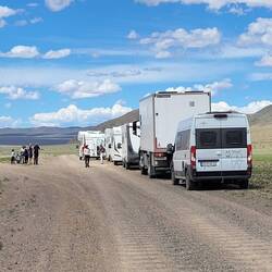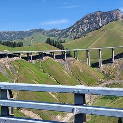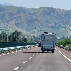 Punkt 10.00h starteten wir die Motoren. Brav mit eingeschalteter Warnblinkanlage, hinter einem mit Blaulicht fahrenden Polizeiwagen, wurden wir aus Khorgos gelotst. An jeder Kreuzung stand ein Verkehrspolizist und hielt für uns den Verkehr an. Dies auf 10 Kilometern, bis zur nächsten Autobahneinfahrt und Zahlstelle. Danach gab es einen Wechsel. In einem zivilen Wagen führten nun andere Polizisten die Blechkarawane an. Kaum aus dem Stadtgebiet veränderte sich das Landschaftsbild drastisch. Die Strecke war landschaftlich sehr malerisch, grün und bergig. Das Gebiet gehört zum Altai-Gebirge. An einem verlockend und erfrischend aussehendem Gebirgssee rauschten wir vorbei. Etwas neidisch beobachteten wir die Menschen, welche sich am Ufer und auf dem Wasser vergnügten. Zwei Gleitschirmspringer genossen hoch über dem See die Freiheit, während wir wehmütig über die hochmoderne und streng überwachte Autobahn rauschten, als ob wir in einem Raum sässen mit VR-Brille auf der Nase. Nach gut drei Stunden Fahrt gab es eine sogenannte Harmoniepause von 15 Minuten. Zum Glück haben wir unsere eigene Toilette dabei. Stehtoiletten sind sehr unpraktisch, wenn man Hosen trägt....und das Handy im Hosensack lose verstaut ist, gemäss Gerd.
