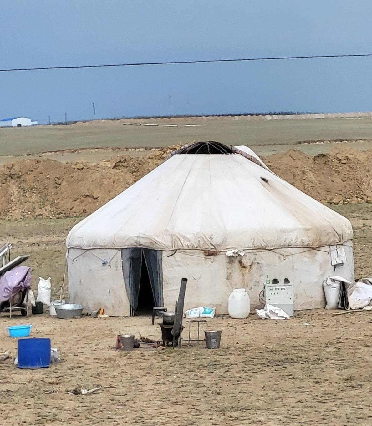 Eine mystische Morgenstimmung begleitete uns bei der Wegfahrt vom Khjargas See. Nur ein paar Kilometer weiter hielten wir an einer Wassertankstelle an. In der Mongolei bekommen wir Wasser für unser Wohnmobil nur an bestimmten Stellen, wo auch die Bevölkerung ihren Bedarf decken kann. Normalerweise braucht es eine sogenannte Wasserkarte für die Bezahlung. Dank einer Abmachung durch Nyama und Dima durften wir gegen Cash das wertvolle Nass nachfüllen. Der Betreiber dieser Ausgabestelle lud mich in seine Jurte ein, während Giotti an der Tränke war und Peter den Füllstand überwachte.