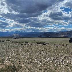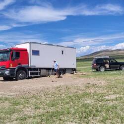 ausgefranster steiniger Schlund auf. Ein harter Schlag mehr, ein Rückspiegel der aus der Fassung hinunterhing, ein fluchender Peter und ich mit einem Pulsschlag von 200...Peter konnte den Rückspiegel wieder einhängen, Giotti scheint den Schlag und ich den Schrecken gut überwunden zu haben. Bis kurz vor dem Endziel führte ich unser mobiles Zuhause an beeindruckenden Bergen und endlosen Steppen vorbei. Für die letzten paar Kilometer ans Ufer des Telmen Sees übergab ich das Lenkrad gerne Peter. Der Weg führte über Steppe, Gras, Sand und Schotter. Jacques und Tatiana standen mit ihrem Lastwagen etwas abseits der vorgegebenen Koordinaten, deshalb folgten sie uns mehr oder weniger, bis sie sich im Sand festgefahren hatten.