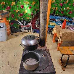 Die Jurte ist das traditionelle Heim der Nomaden in West- und Zentralasien. Wir begegneten bereits vielen dieser Behausungen in Kasachstan und Uigurien/China. Sie werden heute noch als Unterkunft und mobilen Wohnsitz genutzt. Umso mehr schätzte ich die Ehre, welche mir hier erwiesen wurde. Ein ungefähr fünfjähriges Mädchen schlief noch, während mir der Mann stolz anhand von Fotos seine drei erwachsenen Töchter vorstellte. Zwei von ihnen scheinen in Deutschland gewesen zu sein und eine Tochter lebt in Taiwan...falls ich dies richtig verstanden habe. In der Mitte der Jurte stand ein Herd mit einem Ofenrohr, das aus der Krone ragte. Eine zweite Kochstelle die mit Gas betrieben wird war neben dem Eingang aufgestellt.