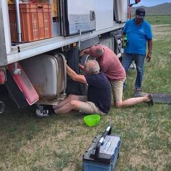 Das musste bei Bier und Wein im Schatten vom Lastwagen gefeiert werden. Dabei erfuhren wir, dass noch einige Fahrer von der Falle Schlagloch Nr. 151 überrascht wurden. ( Die Schlaglöcher werden auf den Strassen in der Mongolei nummeriert...) Die Getränke waren noch nicht ausgetrunken als eine starke Windböe ein paar Mitreisende zu ihrem Fahrzeug springen liess. Achim und Dani waren zu langsam... ihre aufgestellte Markise riss es aus zwei Verankerungen. In der Mitte hielt sie noch fest. Mit vereinten Kräften konnte ein grösserer Schaden am Campervan verhindert werden. Die Markise wurde am folgenden Tag entsorgt.